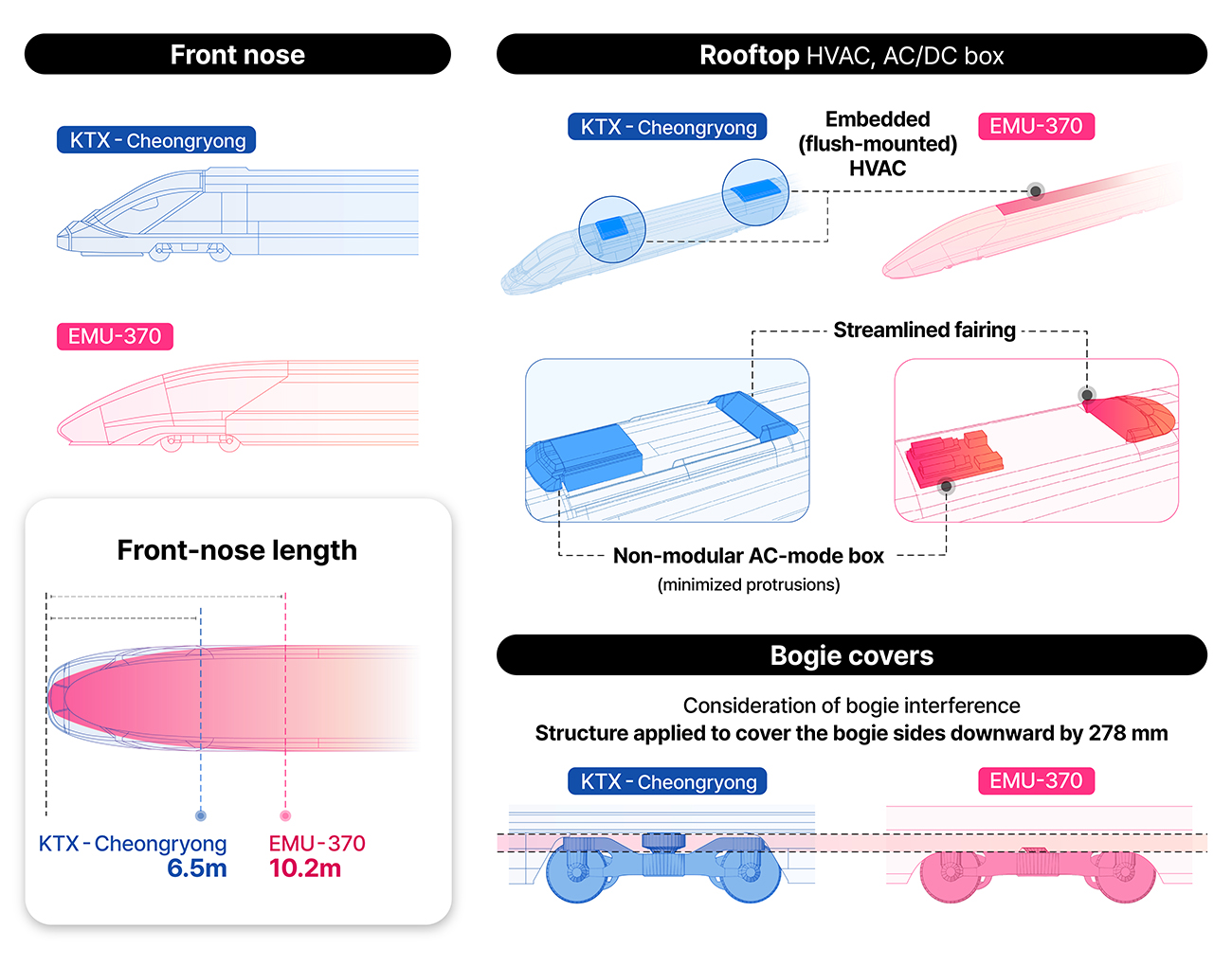 In an ultra-high-speed operating environment reaching 370 km/h, aerodynamic drag accounts for an overwhelming proportion of total running energy consumption. To overcome this, Hyundai Rotem adopted a highly sophisticated approach to the overall vehicle shape design. Compared to the existing KTX-Cheongryong, the EMU-370 extends the nose length by approximately 3.7 meters (with the trainset length increased by 1,000 mm) and adopts a recessed HVAC system to streamline airflow over the roof. In addition, the extensive use of bogie cover structures effectively suppresses aerodynamic drag in the underbody area.