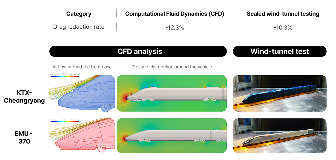 Specifically, the design and testing expertise in the ultra-high-speed domain secured through the development of the 430 km/h-class high-speed test train HEMU-430X served as the technological foundation for the development of the 370 km/h-class next-generation high-speed train EMU-370. The EMU-370 is the successor to the existing 320 km/h-class KTX-Cheongryong, targeting a maximum operating speed of 370 km/h and a maximum design speed of 407 km/h. Beyond simply increasing speed, the primary goal of this development was to realize a commercially viable ultra-high-speed train that simultaneously satisfies safety, quietness, and ride comfort under extreme high-speed operating conditions.