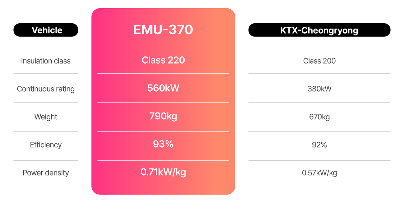 The EMU-370 is equipped with a high-output traction motor of 560 kW class, significantly increasing power density compared to the existing KTX‑Cheongryong (380 kW). The main converter capacity was also boosted to 2,800 kVA, ensuring stable traction performance even in the ultra-high-speed range.