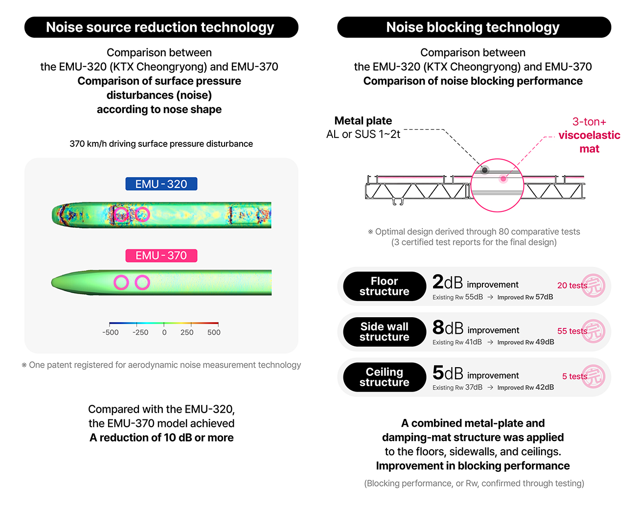 The biggest differentiator of this project was the bold application of the Transfer Path Analysis (TPA) technique — mainly used in high-performance car development — to a high-speed train. By suspending a single train car in the air and attaching over 30–40 three-directional sensors, more than 100 channels of massive data were collected. This allowed us to accurately identify the paths through which noise enters the passenger cabin. Thanks to this, we could identify previously overlooked vulnerable paths and derive improvement measures. Testing with the car body suspended is the first in Korea. Because replicating these test conditions is extremely difficult, such tests are usually only performed at the complete vehicle stage outside the domestic market.